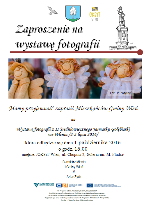 Burmistrz Miasta i Gminy Wleń serdecznie zaprasza na wystawę fotografii Przemysława Zatylnego, poświęconą Średniowiecznemu Jarmarkowi Gołębiarki, który odbył się w dniach 2-3 Lipca 2016. Wystawa fotografii zaplanowana została na dzień 1 października 2016 o godz. 16.00 w Ośrodku Kultury, Sportu i Turystyki /Galeria im. Michała Fludra/
