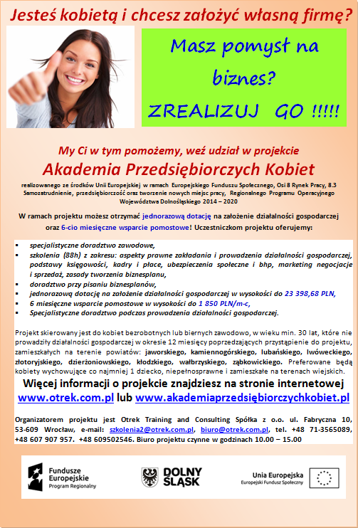 Burmistrz Miasta i Gminy Wleń zachęca do udziału w projekcie pn. "AKADEMIA PRZEDSIĘBIORCZYCH KOBIET". Jest on skierowany do kobiet bezrobotnych i biernych zawodowo. Projekt jest finansowany z Regionalnego Programu Operacyjnego i polega na przeszkoleniu i przygotowaniu do prowadzenia własnej działalności oraz wsparcie finansowe. Uczestniczki projektu, które zdecydują się podjąć działalność gospodarczą i utrzymać ją przez 12 miesięcy otrzymają jednorazową dotację w wysokości 23 398,68 PLN oraz wsparcie pomostowe przez 6 miesięcy w wysokości 1850 PLN/m-c. Projektem tym objęty jest Powiat Lwówecki w tym także Gmina Wleń.