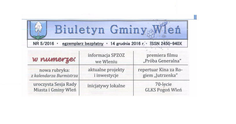 Z przyjemnością publikujemy świąteczny, piąty już numer Biuletynu Gminy Wleń. W nim m. in.: bieżące projekty i inwestycje, 70-lecie GLKS Pogoń Wleń, Inicjatywy lokalne jako obywatelski wkład w rozwój gminy, nowa rubryka pt.: Z kalendarza Burmistrza oraz wiele więcej. Dokładamy wszelkich starań aby w jak najobszerniejszy sposób przedstawiać Państwu to, co dzieje się w naszej Gminie. Życzymy przyjemnej lektury i oczywiście, jak zawsze, czekamy na sugestie i pomysły dot. Biuletynu.