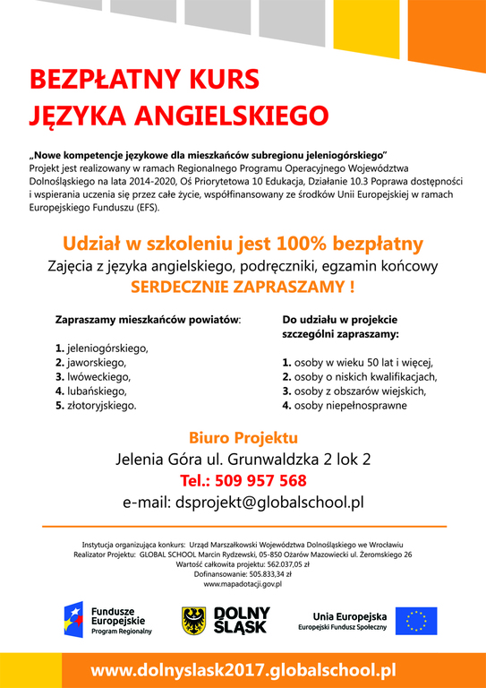 Serdecznie zachęcamy mieszkańców Gminy Wleń do uczestnictwa w bezpłatnym kursie języka angielskiego. Firma (szkoła językowa Global School) gwarantuje nieodpłatne materiały szkoleniowe oraz egzamin końcowy. Realizację kursu języka angielskiego planuje się w Lwówku Śląskim, jednak jeżeli zgłosi się odpowiednia liczba osób (około 20), kurs może być zrealizowany także we Wleniu. Poziom nauczania dostosowany zostanie do wymagań kursantów.