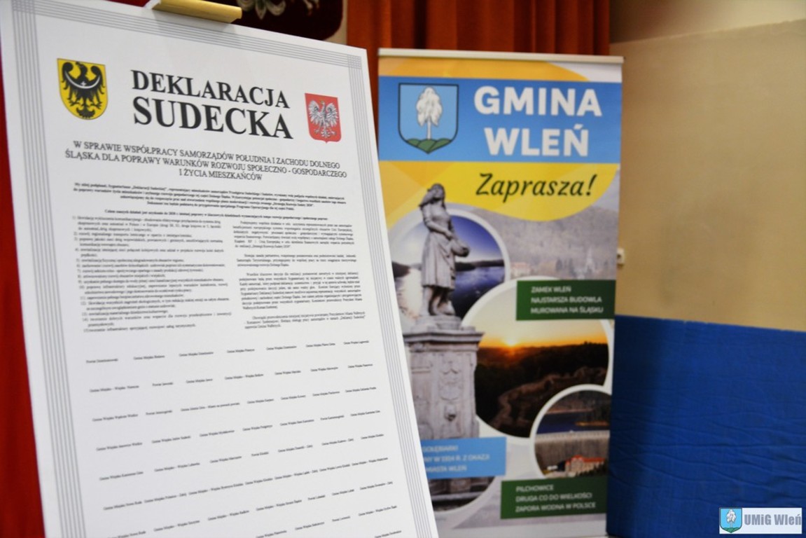 W dniu 11 grudnia 2017 roku w Zespole Szkół im. Św. Jadwigi Śląskiej we Wleniu odbyło się podpisanie Deklaracji Sudeckiej. Na spotkaniu gościliśmy Wicewojewodę Dolnośląskiego Kamila Zielińskiego, Marszałka Województwa Dolnośląskiego Cezary Przybylski, Wicemarszałek Województwa Dolnośląskiego Iwonę Krawczyk, rektorów i pracowników naukowych uczelni wyższych, oraz blisko 100 wójtów,burmistrzów i starostów regionów Jeleniogórskiego i Wałbrzyskiego. Gospodarzami tego spotkana byli Prezydent Wałbrzycha Roman Szełemej pomysłodawca tego działania oraz Artur Zych Burmistrz Miasta i Gminy Wleń. Pan Prezydent Szełemej kilka miesięcy temu wskazał problem braku w następnej perspektywie finansowej środków europejskich skierowanych do Województwa Dolnośląskiego. Wynika to z faktu, że 1,5 roku temu nasze województwo osiągnęło wskaźnik dochodowości na poziomie 75% średniego PKB Unii Europejskiej.