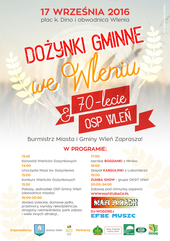 Dożynki Gminne we Wleniu oraz obchody 70-lecia OSP Wleń coraz bliżej bo już w sobotę 17 września! Przypominamy, że odbędą się one na placu koło Dino oraz obwodnicy miasta, na której strażacy gminnych OSP przeprowadzą pokazy. Konkurs wieńców dożynkowych, uroczysta Msza Święta, stoiska rękodzielników, pyszne jedzenie oraz atrakcje dla dzieci to nie wszystko co dla Was przygotowaliśmy. Bawić nas będą zespoły ludowe: Kargulinki z Lubomierza i Bogdanki z Mirska. Zabawę pod chmurką rozkręci zespół muzyczny z Jeleniej Góry Mafi Furach (www.mafifurach.pl), który zagra koncert ok. godz. 20.00. Po koncercie na scenę wejdzie DJ Wodzirej Filip Bednarczyk, który nie tylko zaserwuje świetną muzykę ale również przeprowadzi konkursy dożynkowe. W planach m. in. rzut ziemniakiem do wiadra oraz wyścig z jajkiem - a w jaki sposób - to zobaczycie :) Serdecznie zapraszamy na Gminne Święto Plonów. W planach mamy ciekawe spędzenie czasu, efektowne pokazy jednostek straży pożarnych OSP Gminy Wleń oraz świetną zabawę aż do północy!! To do zobaczenia!!