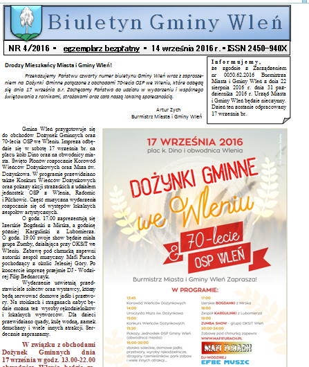 Prezentujemy Państwu najnowszy Biuletyn Gminy Wleń (nr 4/2016). A w nim o przygotowaniach do Dożynek Gminnych, które już w sobotę 17 września, obchody 70-lecia OSP, Program Rewitalizacji i Termomodernizacji w Gminie Wleń, informacje Miejsko- Gminnego Ośrodka Pomocy Społecznej we Wleniu, bieżące aktualności, wydarzenia w Kinie za Rogiem, terminarz gminnych klubów sportowych i wiele więcej. Biuletyn został wydany również w formie papierowej. Można go zdobyć m. in. w Kiosku i Piekarni we Wleniu. Dodatkowo Biuletyn rozprowadzono po sołectwach Gminy Wleń. Jak zawsze czekamy na Wasze propozycje i sugestie. Przyjemnej lektury!