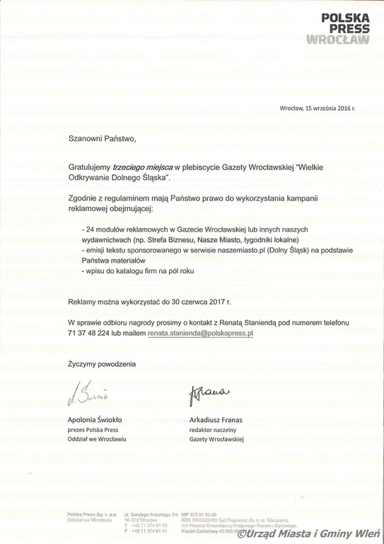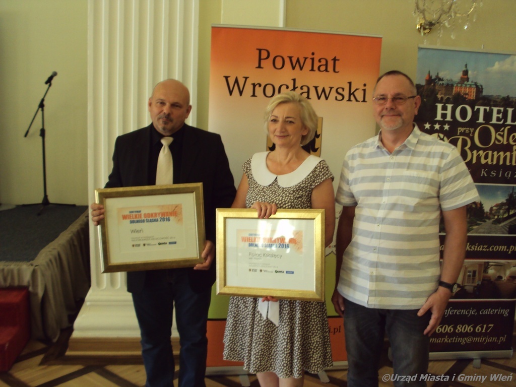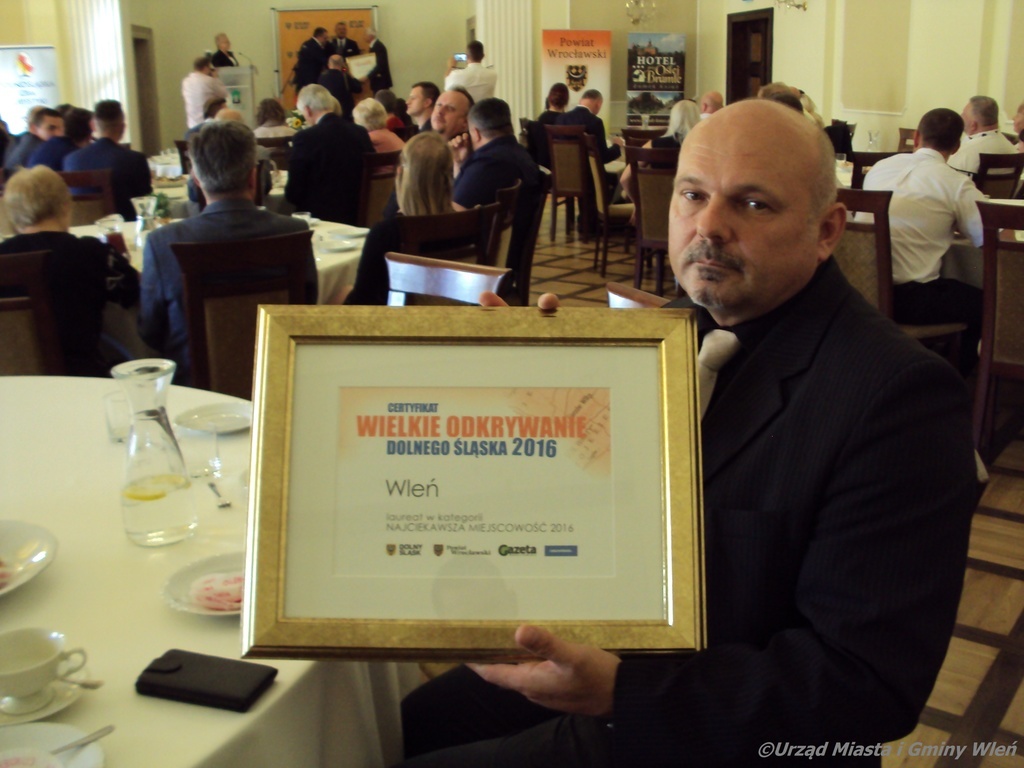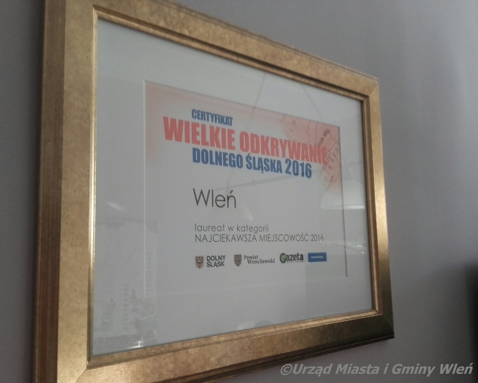Z radością informujemy, że Wleń w Plebiscycie Gazety Wrocławskiej i portalu naszemiasto.pl „Odkrywamy Dolny Śląsk” w kategorii Najciekawsza Miejscowość Dolnego Śląska zdobył 3 miejsce. Pierwsze miejsce w kategorii Najlepszy Pensjonat otrzymał Pałac Książęcy we Wleniu. Gala Laureatów odbyła się dnia 15 września br. w Sali Balowej Zamku Książ. Nagrody odebrali: Państwo Bożena i Sławomir Osieccy oraz Burmistrz Miasta i Gminy Wleń Artur Zych. Jeszcze raz dziękujemy za głosy oddane na naszą miejscowość. To Państwo przyczyniliście się do tego, że Wleń oraz jego atrakcje są coraz bardziej znane i popularne. To nasz wspólny sukces. Wierzymy, że w następnym roku wynik będzie jeszcze lepszy. Zapraszamy do obejrzenia fotorelacji z wydarzenia.